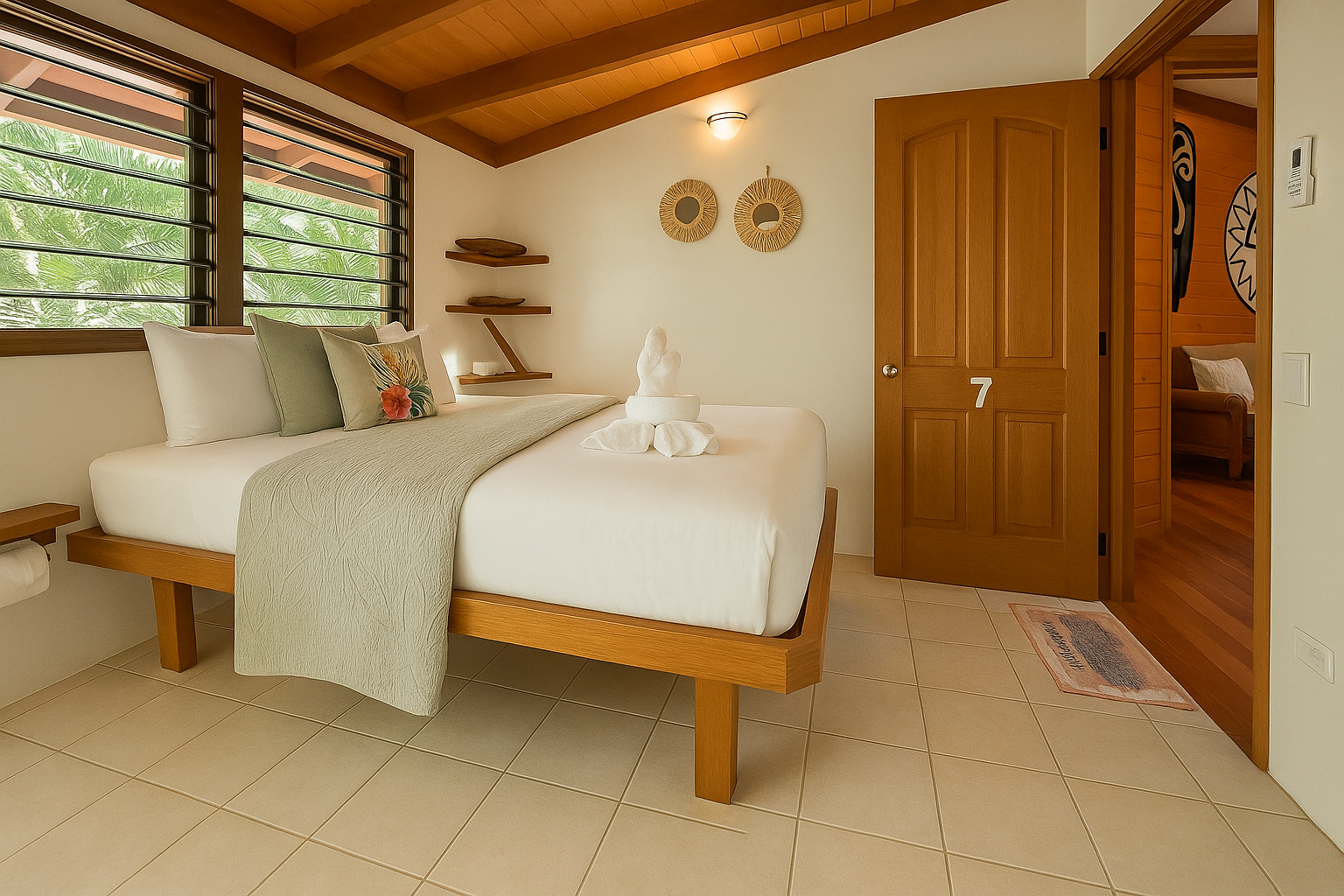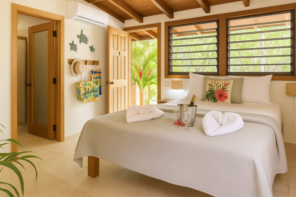 This is our smallest room type and is ideal for guests who plan to spend most of their time exploring the island and resort. Each room includes a private ensuite bathroom and a small outdoor sitting area, with garden pathways leading toward the ocean.